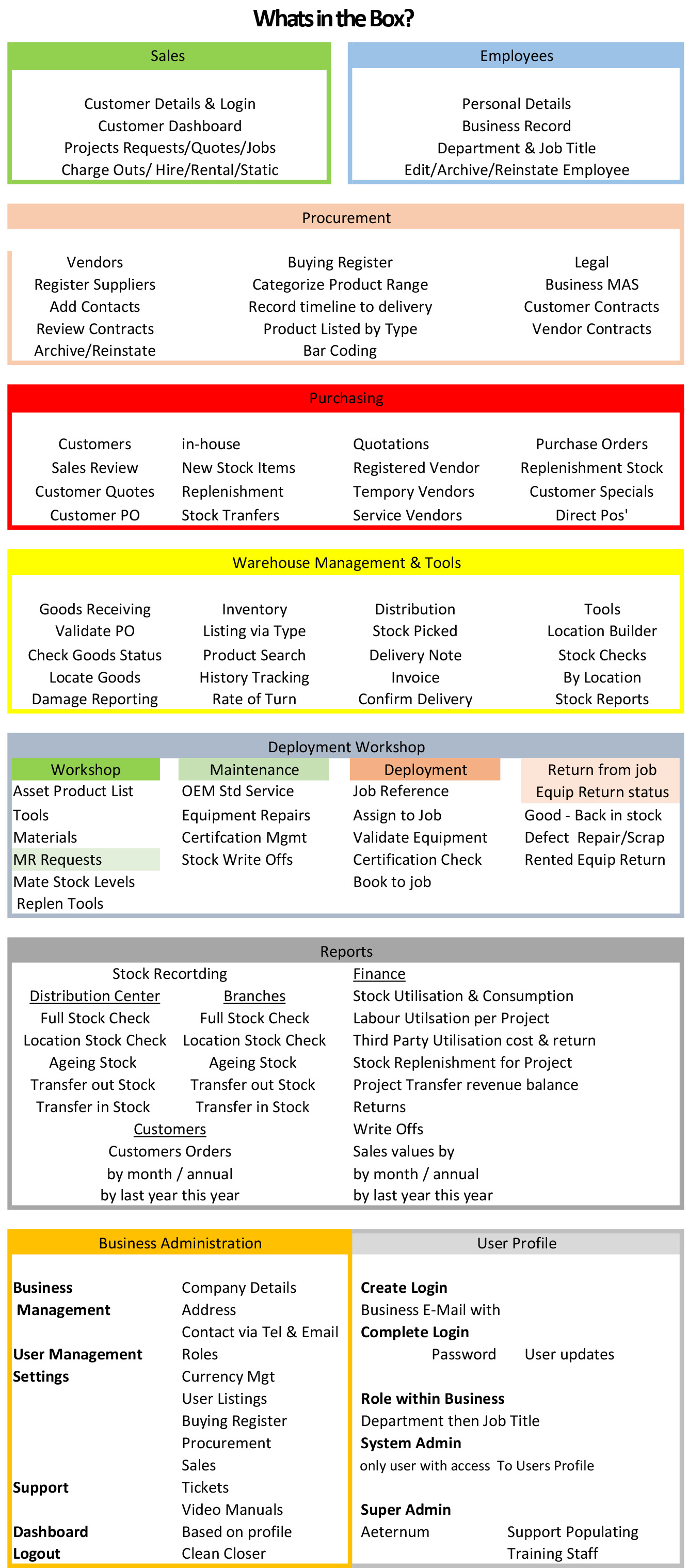 Why not add a Warehouse (WHM) or a Human Resorces (HR) SaaS solution to your requirments, they have a lot to offer!